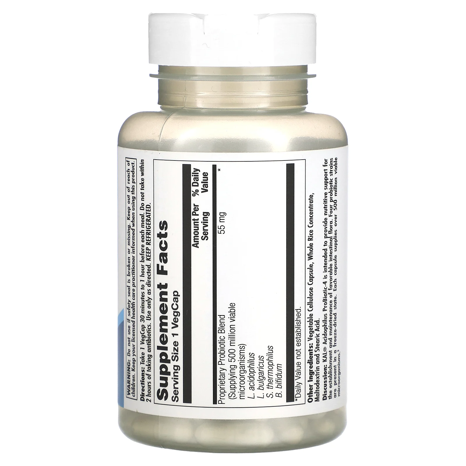Описание. KAL® Acidophilus ProBiotic-4 предназначен для обеспечения питательной поддержки для создания и поддержания благоприятной кишечной флоры. Четыре штамма пробиотиков находятся в лиофилизированном состоянии. Каждая капсула содержит более 500 миллионов жизнеспособных микроорганизмов.